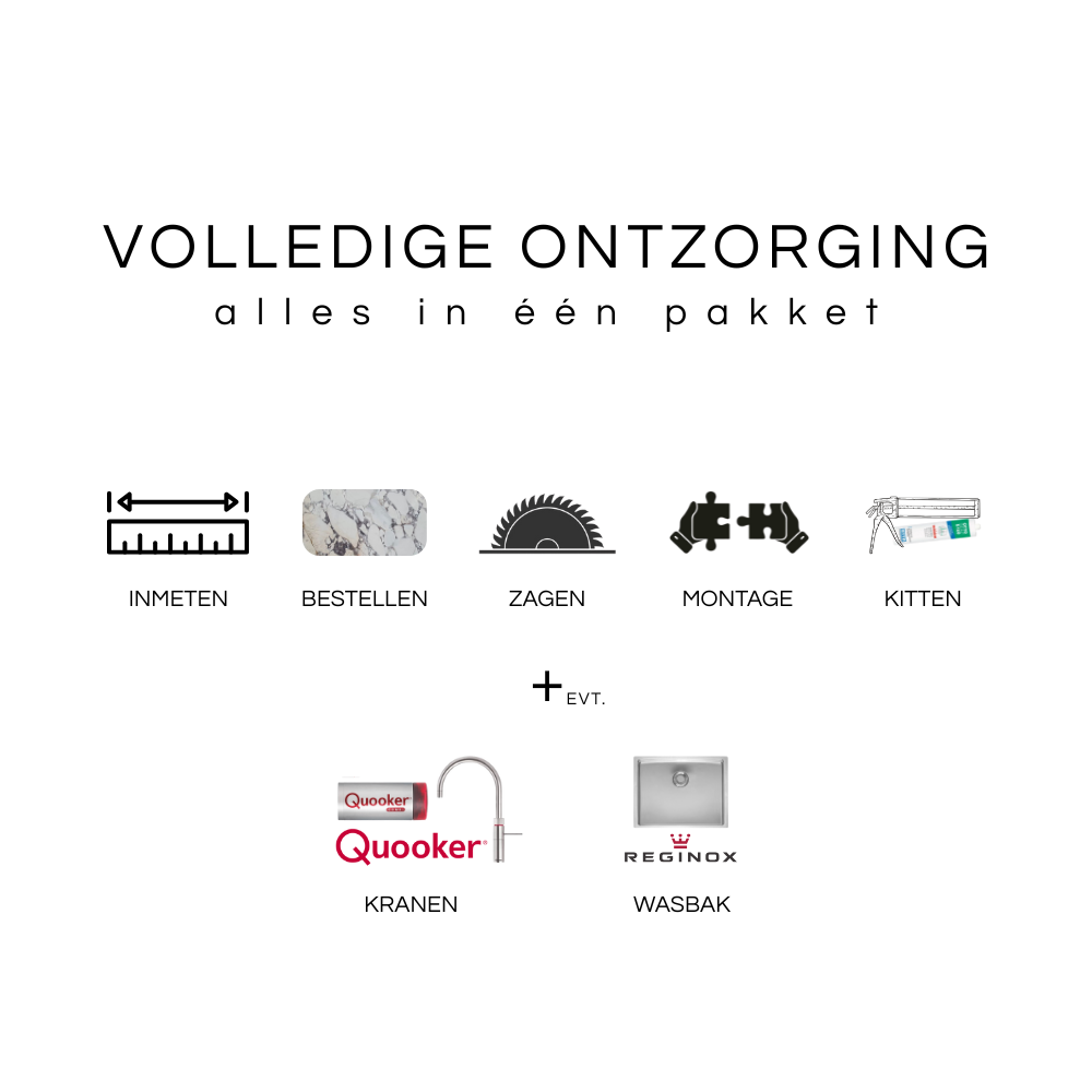Uw keuken wordt compleet met onze selectie van Quooker-kranen en Reginox-wasbakken. Als officieel dealer bieden wij u de volledige garantie en het gemak van één aanspreekpunt. Wilt u iets unieks? Wij kunnen ook een wasbak uit hetzelfde marmer, keramiek of kwartsiet vervaardigen, waarbij de aders prachtig doorlopen in het blad; een statement van puur vakmanschap.